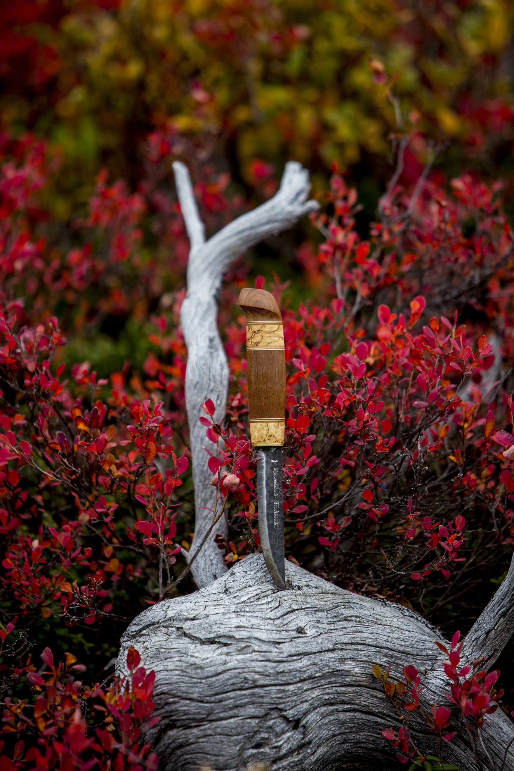 The traditional material used for Finnish knife handles is curly birch. The material comes from the curly birch belt in Central Finland. The blaze-patterned curly birch is an excellent fit as a material for a knife handle, because it’s durable and fair. This beautifully patterned curly birch is available on the market in limited amounts, which makes the price notably higher than regular birch.
