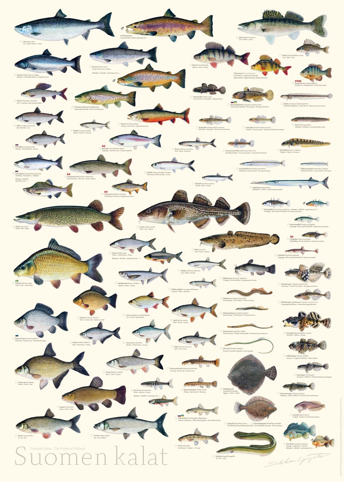 Passionate fisher and artist Sakke Yrjölä has illustrated a splendid poster presenting the species of fish found regularly in Finland. The same illustrations can also be found in the Fishes of Finland book published in 2015 that has received plenty of praise. The poster shows the species grouped into families. You can see the fish swimming in Finnish waters with a single glance.